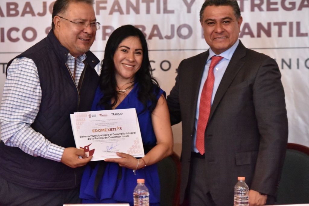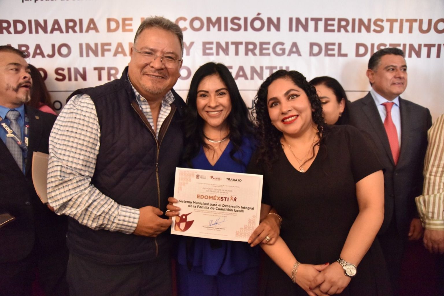 El distintivo fue entregado a 84 centros de trabajo del sector público, privado y social entre los que destaca Cuautitlán Izcalli, durante la cuadragésima primera sesión ordinaria de la Comisión Interinstitucional para la Erradicación del Trabajo Infantil, celebrada en el Salón del Pueblo del Palacio Municipal de Tlalnepantla de Baz.