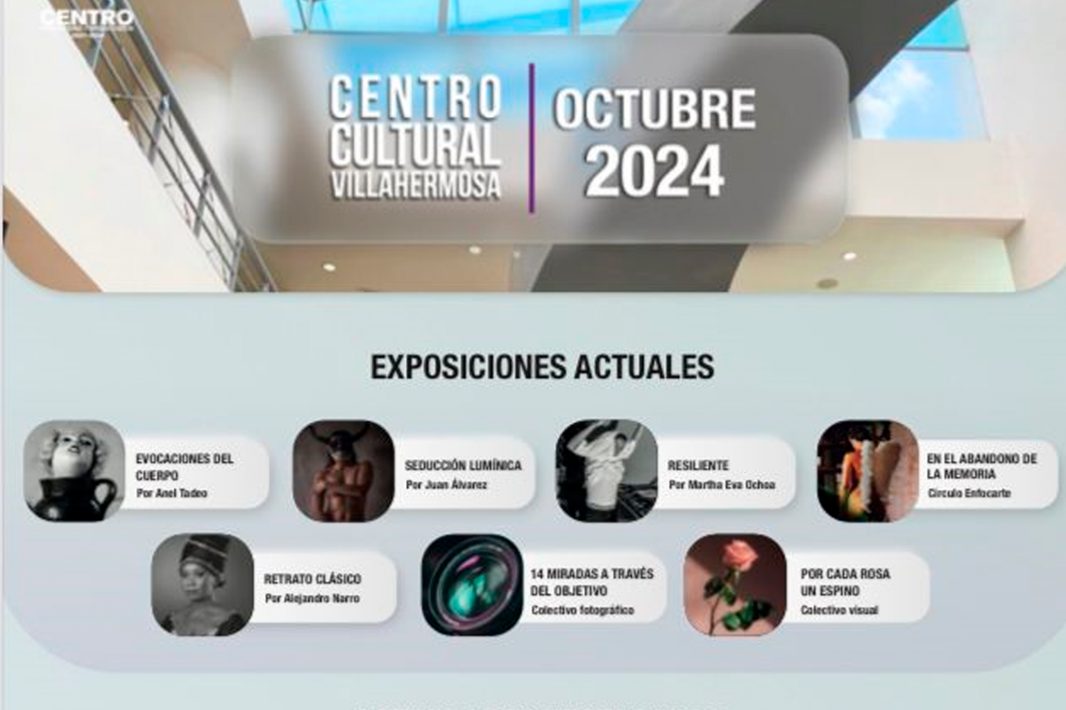 Por medio de la Dirección de Educación, Cultura y Recreación (DECUR), en el CCV pueden admirarse las exposiciones “Evocaciones del cuerpo” de Anel Tadeo; “Seducción lumínica”, de Juan Álvarez; “Resiliente”, de Martha Eva Ochoa; “En el abandono de la memoria”, del Círculo Enfocarte; “Retrato clásico”, de Alejandro Narro; “14 miradas a través del objetivo”, del Colectivo Fotográfico y “Por cada rosa un espino”, del Colectivo Visual.