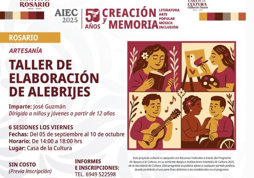 #Rosario, #Sin.- Este 05 de septiembre el Ayuntamiento de Rosario y el Instituto Sinaloense de Cultura realizarán el Taller de Elaboración de Alebrijes, dirigido a niños y jóvenes a partir de los 12 años.