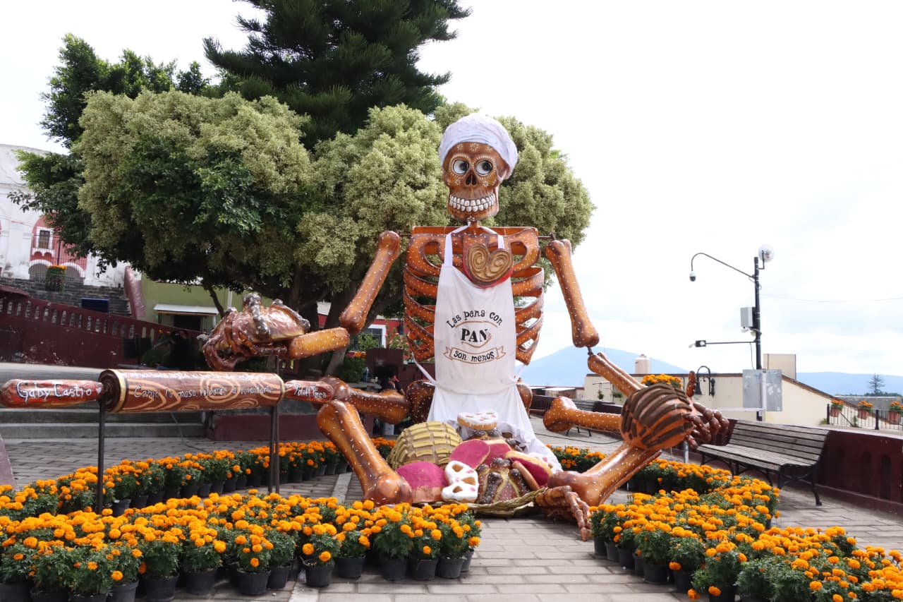 “La Catrina El Panadero” puede admirarse en la Plaza Fray Toribio, a un costado del exconvento Franciscano, como parte del recorrido que consolida a Atlixco, como la Capital del Día de Muertos.
