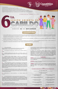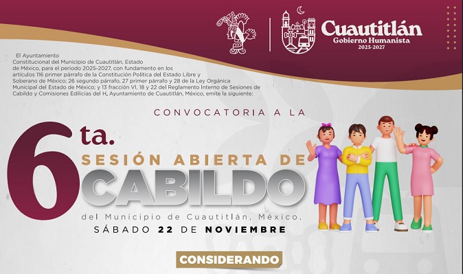 #Cuautitlán#EstadoDeMéxico.- El Gobierno Municipal de Cuautitlán, bajo el liderazgo de la presidenta constitucional Juanita Carrillo Luna, extiende una cordial invitación a la ciudadanía para sumarse a la Sexta Sesión Ordinaria de Cabildo Abierto, un ejercicio democrático fundamental que fortalece la transparencia, la participación ciudadana y la rendición de cuentas de esta administración. Esta iniciativa se alinea con la visión de un “Gobierno Abierto”, donde el diálogo constante y constructivo entre la autoridad y los habitantes es la base para consolidar un municipio más justo, ordenado y con pleno bienestar para todos. La presencia y la voz de la comunidad son consideradas piezas esenciales en la toma de decisiones.