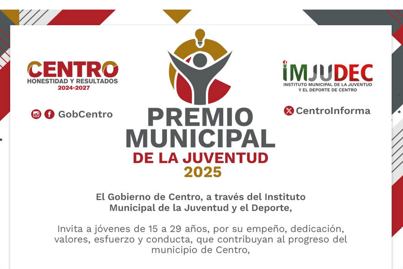 Los interesados en participar individual o grupalmente en el Premio Municipal de la Juventud 2025 deberán ser originarios de Centro o con tres años de residencia mínima comprobable y con edad entre 15 y 29 años.